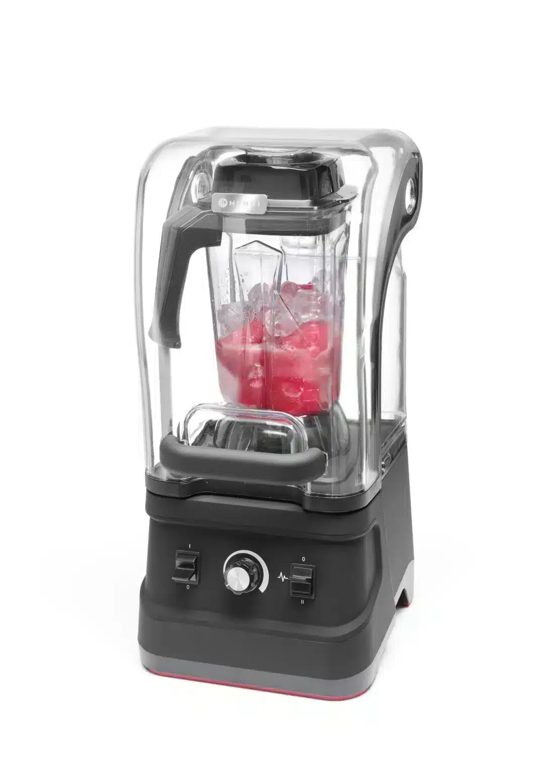 De HENDI Bar blender met geluiddempende kap zorgt ervoor dat het geluidsniveau laag blijft, of je nu fruit of groenten mengt of ijs crusht. De snelheid van de blender kan nauwkeurig worden ingesteld om het gewenste resultaat te bereiken met de handmatige, traploze snelheidsregelknop. De perfecte keuze voor het efficiënt en stil maken van cocktails, smoothies en andere drankjes.