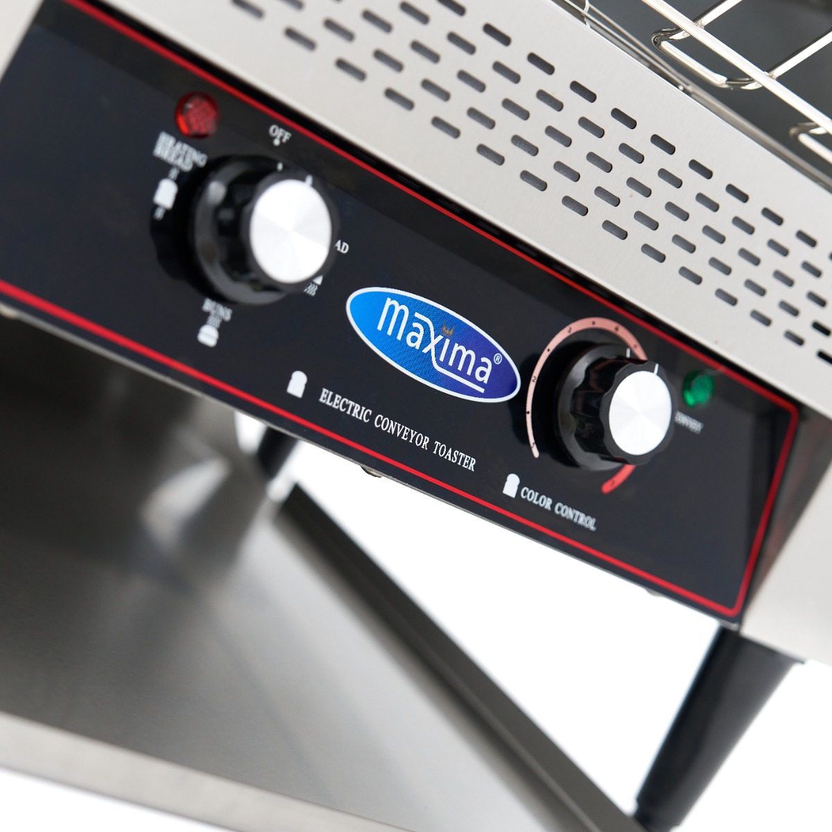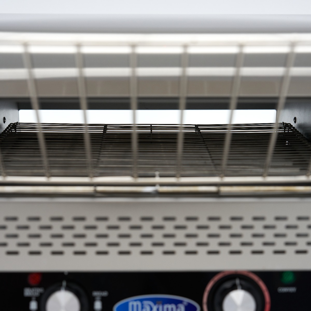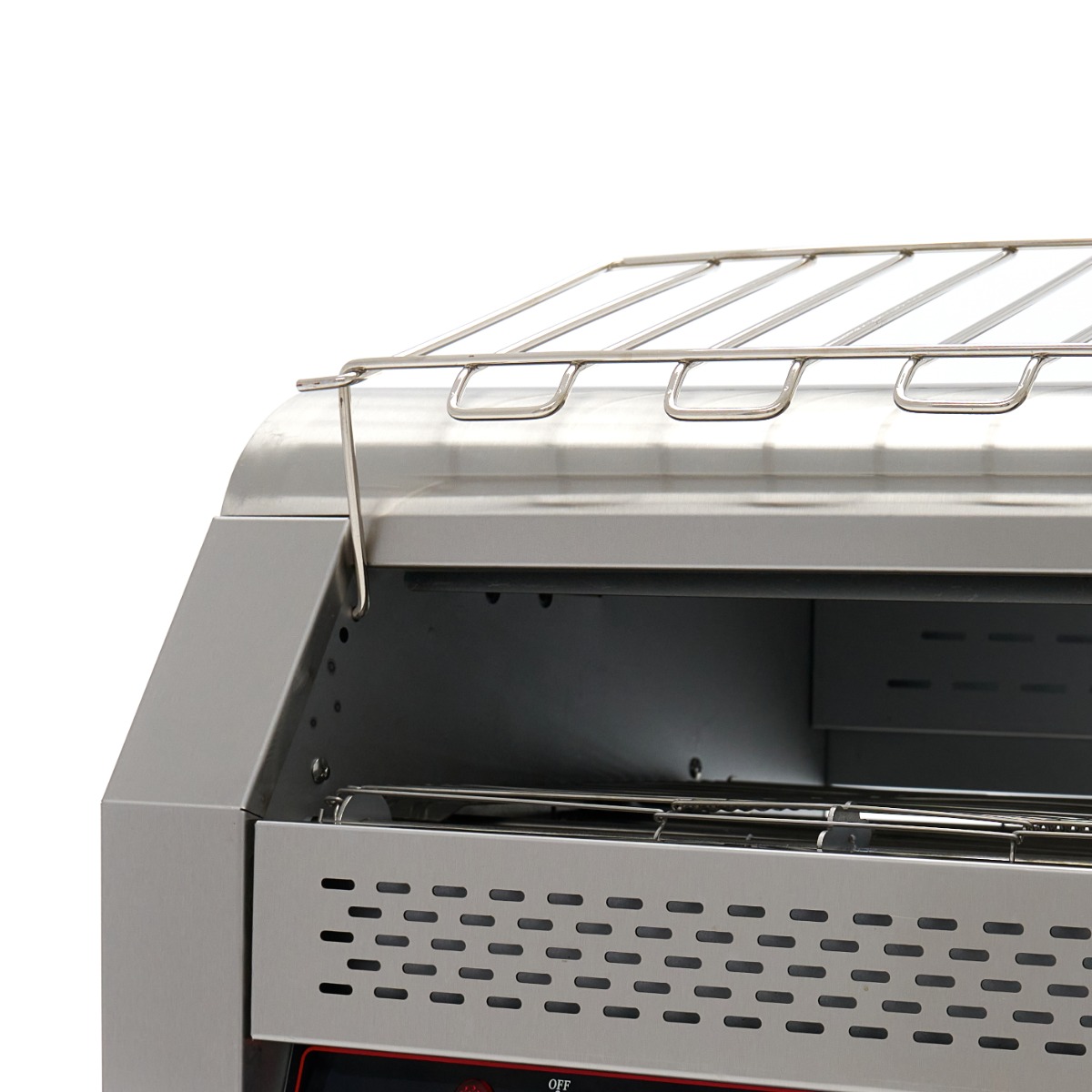 Dit doorloop broodrooster is uitgerust met twee praktische draaiknoppen voor een nauwkeurige bediening. Met de eerste knop kies je de gewenste verwarming: alleen bovenwarmte, een combinatie van boven- en onderverwarming of een speciale stand voor pistolets. De tweede knop regelt de snelheid van de transportband, waardoor je eenvoudig de gewenste bruining instelt. Lichtere boterhammen worden sneller getransporteerd, terwijl donkerder brood langer in het apparaat blijft. De snelheid is instelbaar van 1 tot 9 rotaties per minuut.