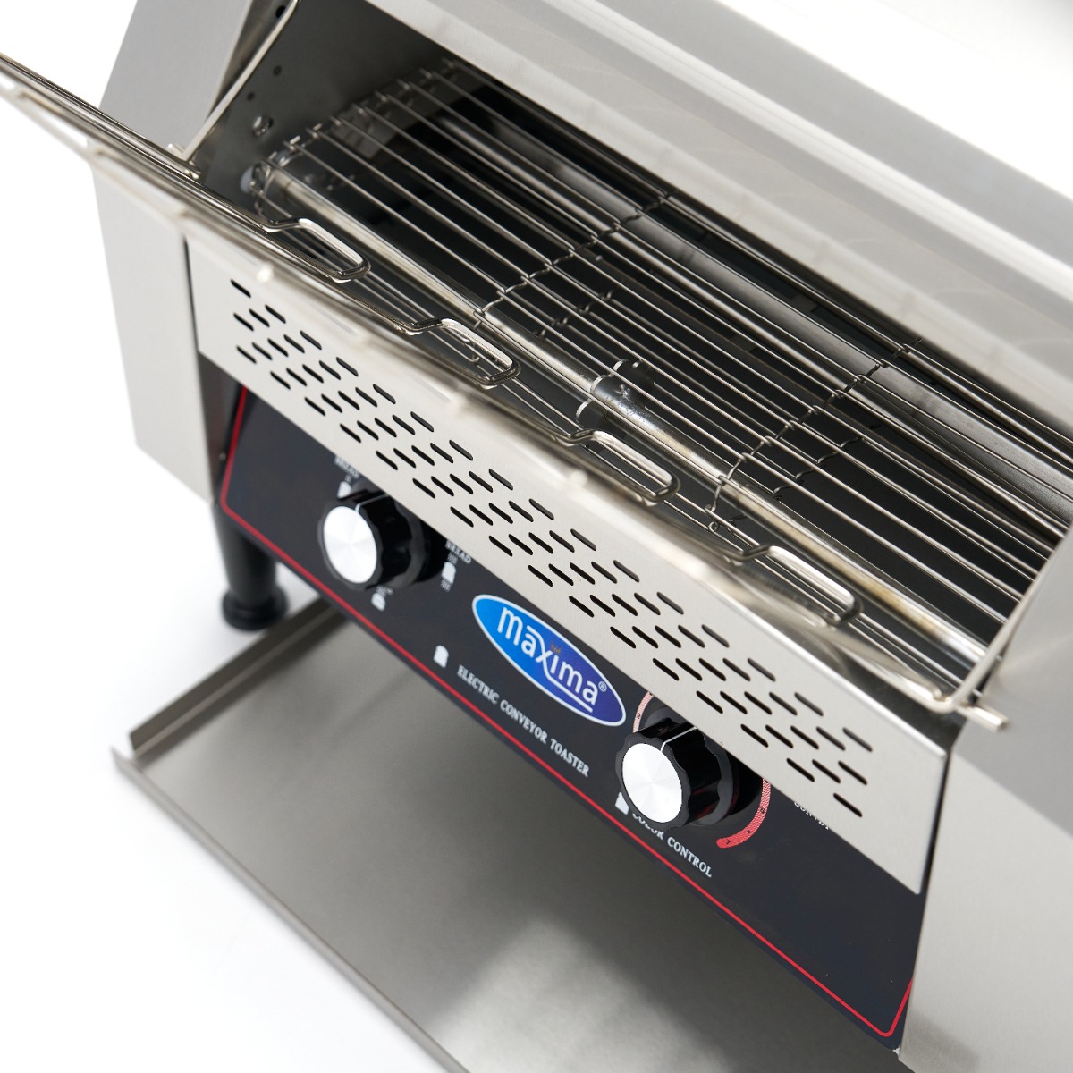 Voor een optimaal resultaat is het belangrijk dat alle losse aan- en uitvoeraccessoires correct zijn bevestigd voordat je begint. Zet de machine aan, selecteer de gewenste temperatuurinstelling en stel de bruining in. Zodra de lopende band begint te bewegen, kun je de boterhammen achter elkaar invoeren en laat het apparaat de rest van het werk doen.