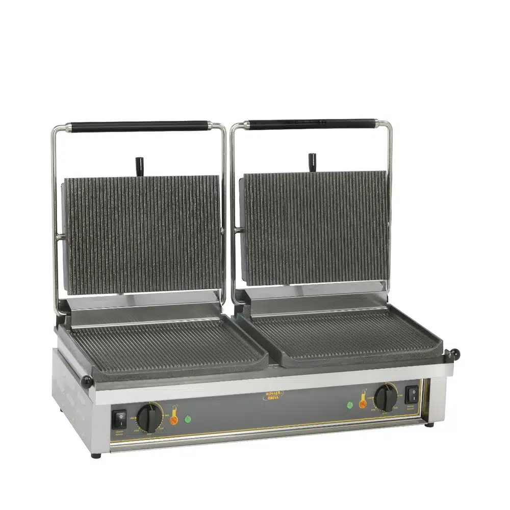 De Panini contactgrill van “Roller Grill” Power is een krachtige grill met een vermogen van 6 kW of 2 x 3 kW, geschikt voor het snel bereiden van heerlijke panini’s en andere gegrilde gerechten. De grill heeft een ruwe gietijzeren coating voor optimale warmteverdeling en duurzaamheid. Met afmetingen van 835 x 385 x 220 mm en een bakoppervlak van 2 x (360×240) mm biedt het voldoende ruimte voor het bereiden van meerdere porties tegelijk. De grill weegt 45 kg en werkt op 400 V of 2 x 230 V, waardoor het geschikt is voor gebruik in diverse keukenomgevingen.
