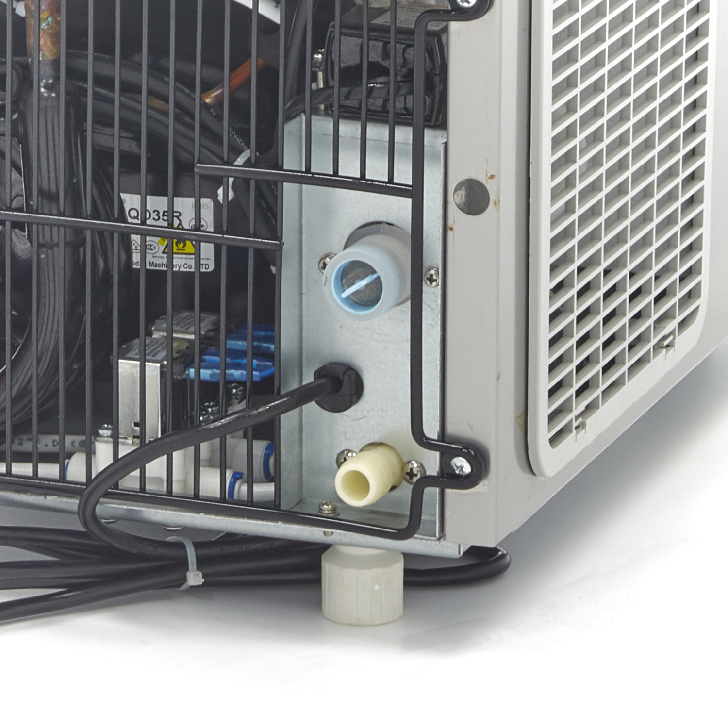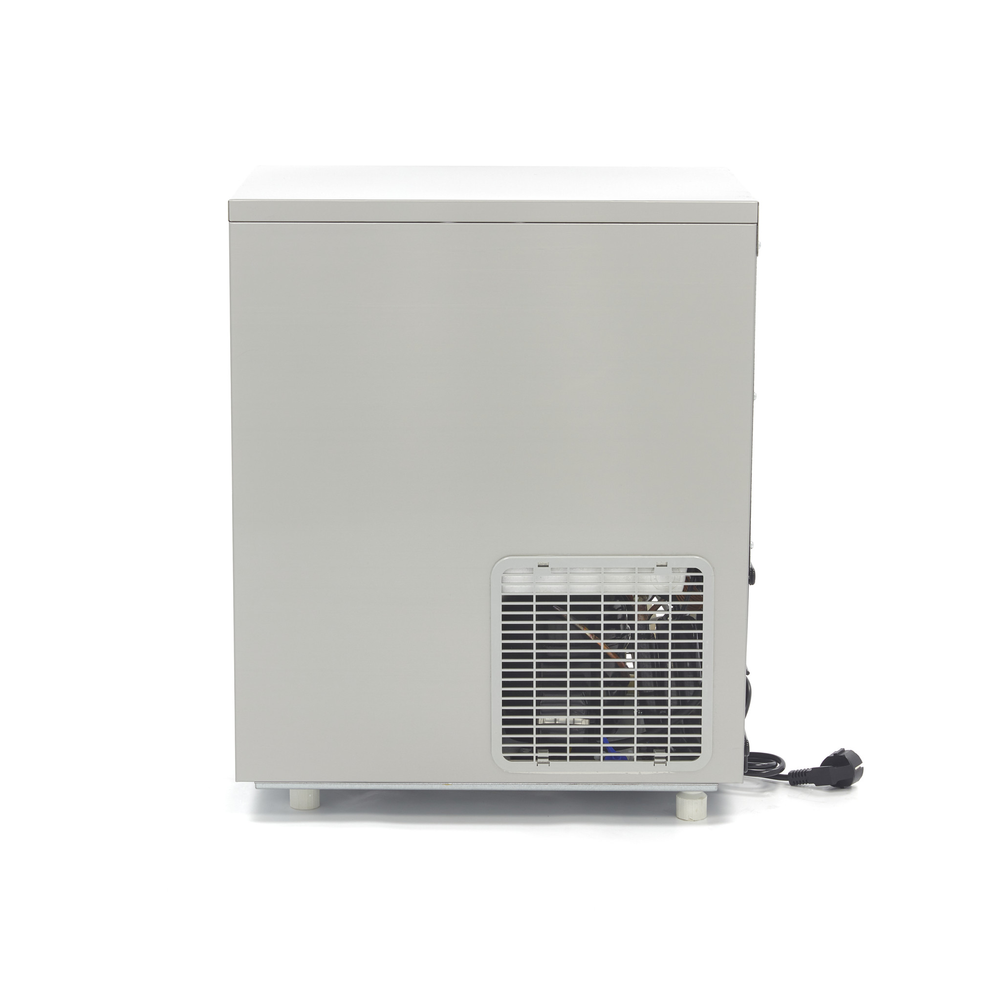Via de achterkant wordt deze professionele ijsblokmachine watergekoeld. Je kunt dit apparaat zeer goed gebruiken in warme ruimtes of buiten. Daarnaast is de ijsmachine voorzien van een bescherming tegen overbelasting. Zo kun je veilig blijven werken en hoef je niet bang te zijn dat de ijsblokjesmachines overbelast raakt. Het efficiënte koelsysteem zorgt voor goed gevormde ijsblokjes van hoge kwaliteit. Het koudemiddel dat wordt gebruikt voor deze machine is R290. Deze professionele ijsblokjesmachine wordt geleverd met toevoerslangen die worden aangesloten op de drinkwateraansluiting voor automatische aanvoer van water. De afvoerslang dient lager aangesloten te worden dan de uitloop van de machine. Op het bedieningspaneel staan een aantal indicatielampjes om te waarschuwen voor een fout of storing, een volle voorraadbak en een laag waterniveau. Zo weet je precies welke actie je moet ondernemen om te zorgen dat de productie van ijsblokjes weer verder kan gaan.