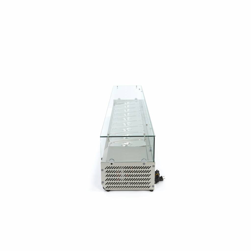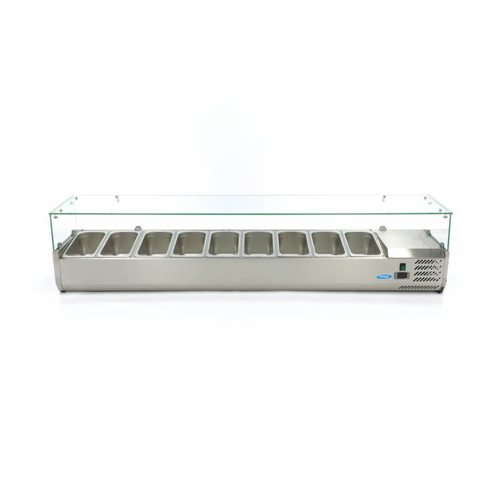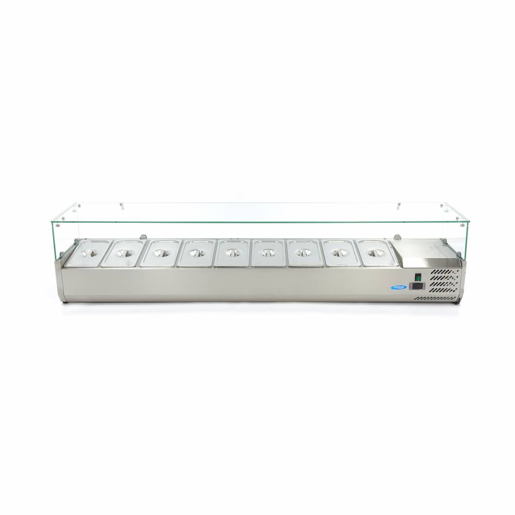 Salades, verse kruiden, groente, fruit, diverse vleessoorten: welk eten je ook serveert, in deze brede opzetkoelvitrine is er plek genoeg voor verschillende etenswaren. De gekoelde opzetvitrine biedt ruimte voor maar liefst 9 x 1/3 GN-bakken met of zonder deksel. Zo kunnen gasten in een restaurant, hotel of bijvoorbeeld bedrijfskantine makkelijk en snel een keuze maken en zichzelf bedienen. Goed om te weten is dat de GN-bakken en bijhorende deksels apart verkrijgbaar zijn en niet worden meegeleverd.