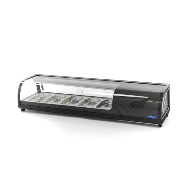 De sushivitrine is geschikt voor het presenteren van sushi maar ook voor het koelhouden van tapasgerechten en visproducten. Deze professionele tapasvitrine kan gebruikt worden in combinatie met gastronormbakken. Standaard worden er 5 x 1/3 GN-bakken meegeleverd bij deze sushivitrine.