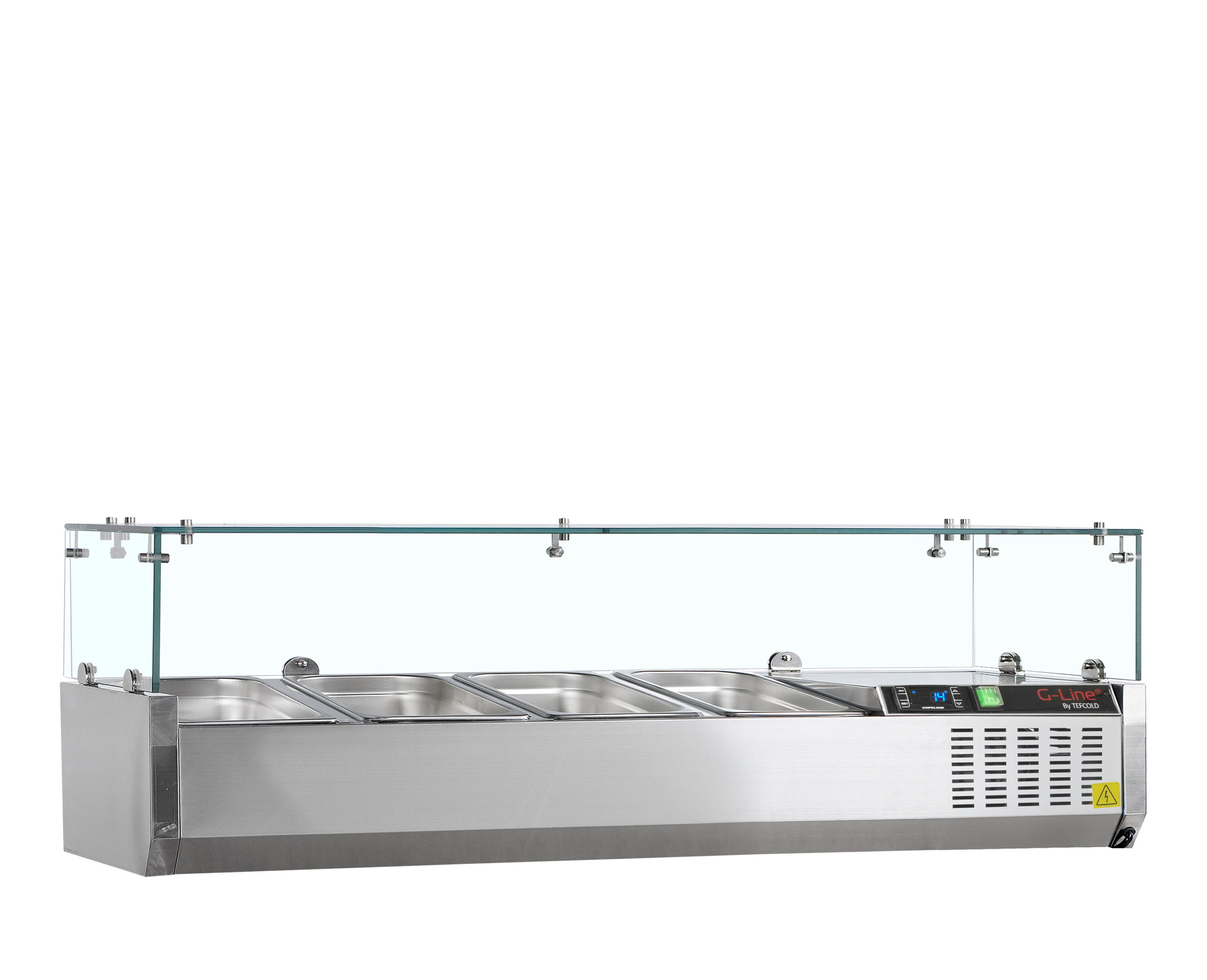 De GVC-serie vitrinekoelers is een geweldige aanvulling op de gastronomische counter, omdat u hiermee alles wat u nodig hebt voor de voedselbereiding binnen handbereik hebt. Geschikt voor GN1/4 bakken (niet inbegrepen). De koeler is gemaakt van roestvast staal SS201 met een glazen niesbeschermer om het voedsel te beschermen. Ideaal voor pizzeria’s, fastfoodrestaurants en broodjeszaken.