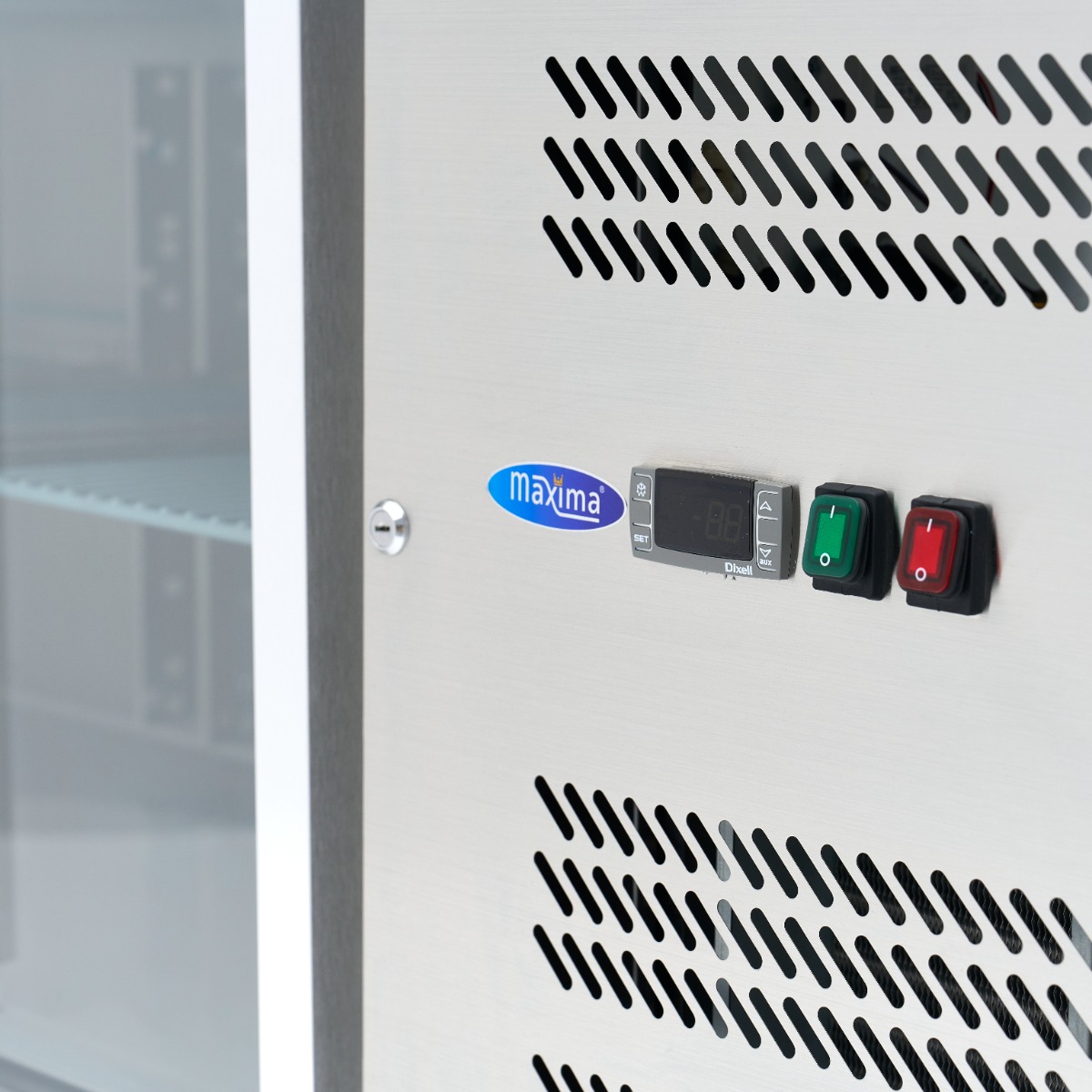 De grootste koelwerkbank in het assortiment van Maxima is deze werkbank met maar liefst vier deuren en een afsluitbare compressorruimte. De koelwerkbank is voorzien van zes wielen waarvan de voorste wielen zijn voorzien van een rem. Hiermee kun je de koelwerkbank makkelijk verplaatsen. De vier glazen deuren hebben een stevige handgreep en verwarmde deurrubbers om aanvriezen te voorkomen. De deuren zijn zelfsluitend door middel van magnetische deurafdichtingen. Hierdoor voorkom je dat koude lucht verloren gaat als de deur niet goed afsluit. Ook kun je goed zien waar je wat hebt opgeslagen, zo hoef je niet onnodig deuren te openen. Wanneer je ingrediënten moet bestellen, zie je in één oogopslag wat je voorraad is.