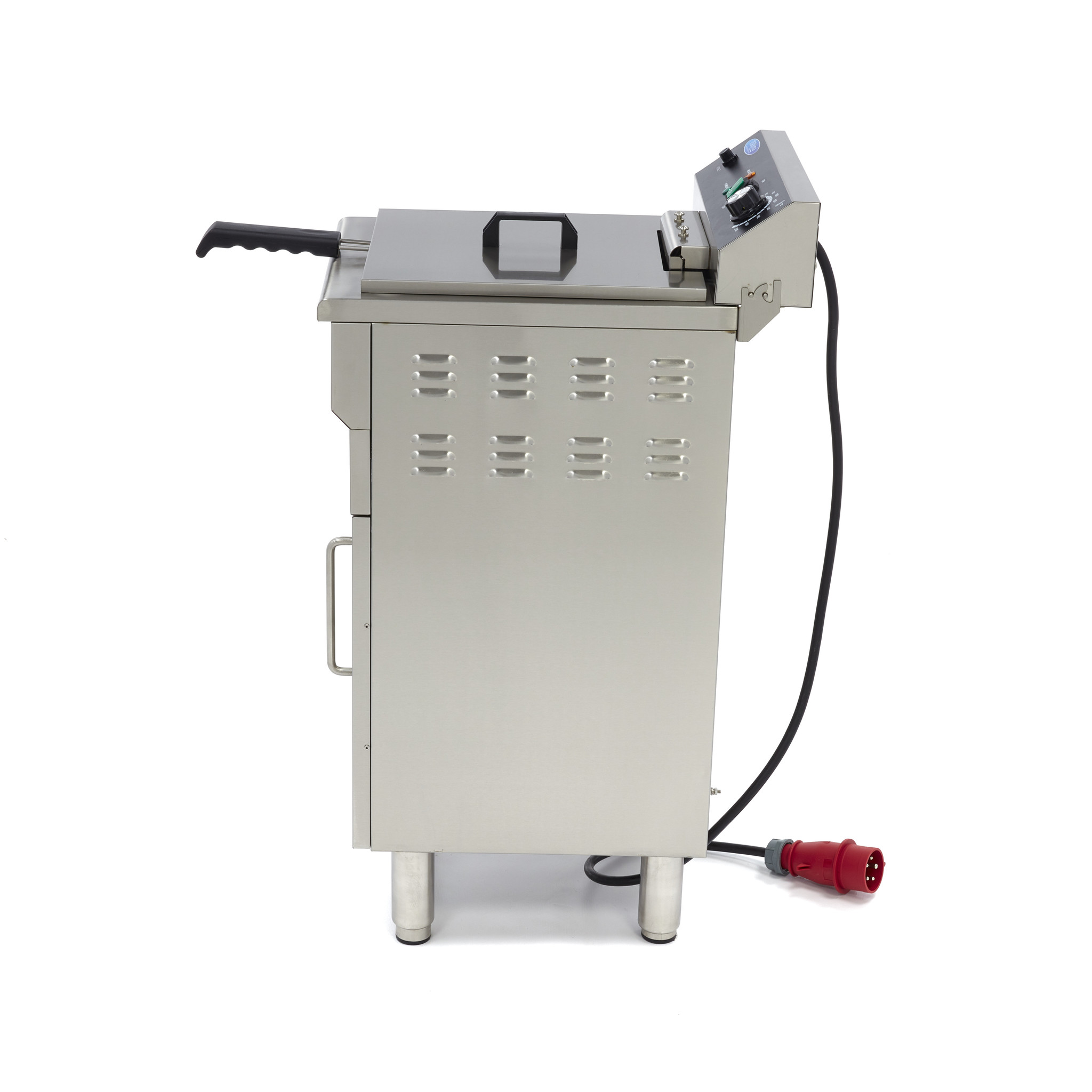 Deze professionele frituurpan is gemonteerd op een onderstel en werkt op krachtstroom. Omdat het apparaat is voorzien van een koude zone kun je langer blijven frituren met dezelfde olie. Het verwarmingselement hangt namelijk een paar centimeter boven de bodem waardoor de olie eronder minder heet wordt. Kruimels die naar de bodem zakken verbranden minder snel waardoor de olie langer goed blijft. Het verwarmingselement is in te stellen met behulp van de thermostaat en kan temperaturen aan tussen de 50 °C en 200 °C. De indicatielampjes geven aan wanneer het apparaat klaar is voor gebruik.