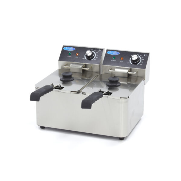 Voor het frituren van een dubbele hoeveelheid snacks en frites maak je gebruik van deze elektrische dubbele frituurpan. Met een capaciteit van 2 x 4 liter is het een zeer welkome aanvulling in elke horecakeuken. Ideaal voor het frituren van 2 x 0,8 kg frites. Daarnaast beschikt deze professionele frituurpan over een instelbare thermostaat voor elke frituurpan zodat je tegelijkertijd frites kunt bereiden in de ene pan en snacks in de andere. En dat op een gewenste temperatuur tussen de 50°C en 200°C. Is het oranje lampje uit? Dan is de olie op temperatuur en is de friteuse klaar voor gebruik.