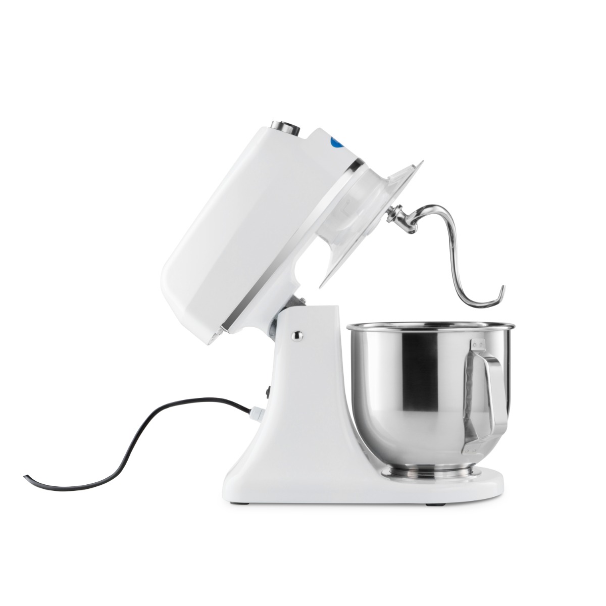 De professionele planeetmenger is heel makkelijk te gebruiken. Met de hendel open je de planeetmenger om de mengkom te verwijderen of accessoires te verwisselen. De kop van het apparaat is voorzien van een veiligheidsschakelaar zodat de planeetmenger automatisch stopt wanneer de kop naar boven gaat. Aan- en uitzetten doe je met de aparte start- en stopknop. Om te voorkomen dat de bewegende delen aangeraakt kunnen worden wanneer de keukenhulp aanstaat, is de planeetmenger voorzien van een kunststof beschermkap. Door middel van de vulopening boven de kom kun je ingrediënten toevoegen tijdens het kneden of mengen. Alle losse RVS onderdelen zijn makkelijk schoon te maken in de vaatwasser.