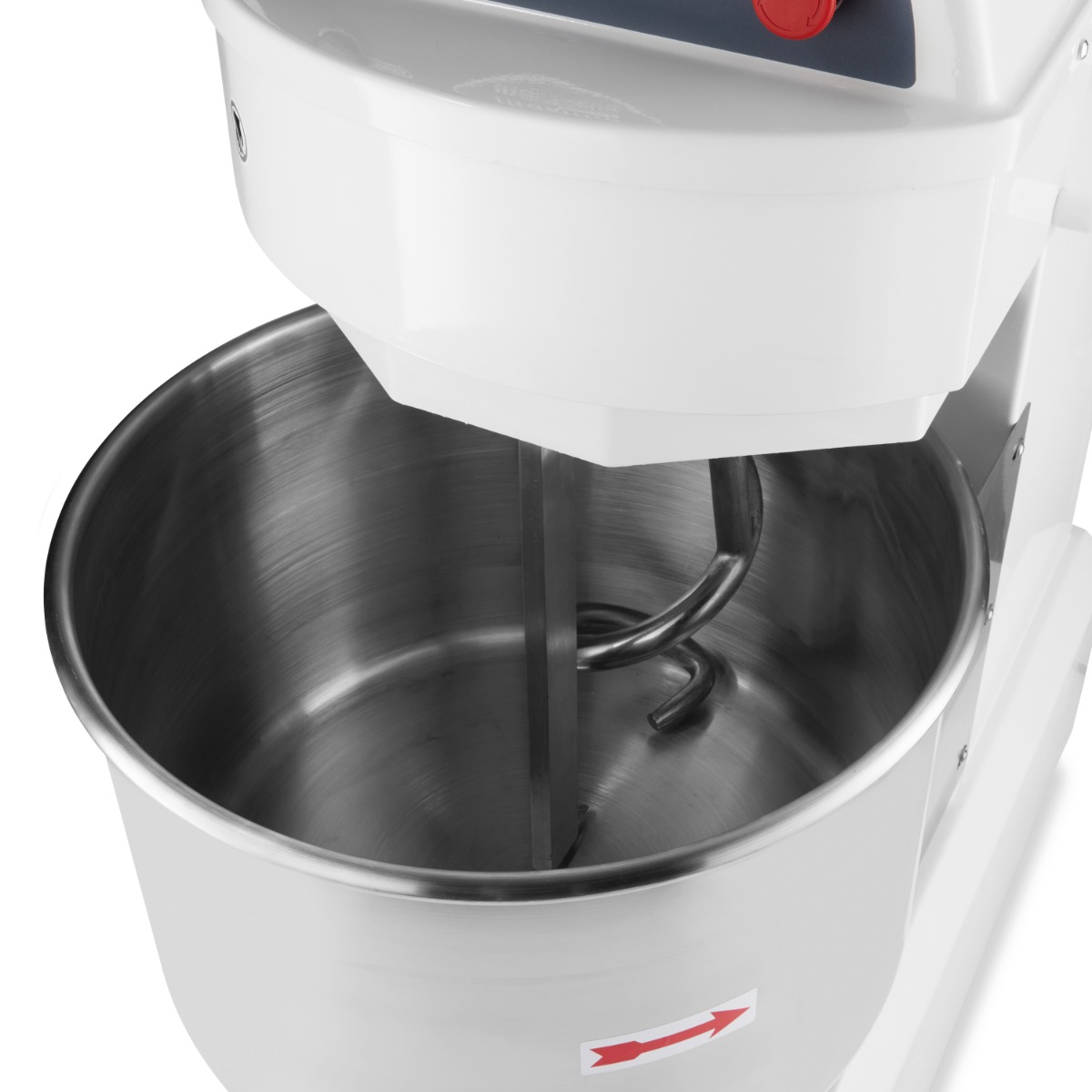 De motor van deze spiraalkneder is sterk en stil zodat je in alle rust grote porties deeg kunt kneden. Er zijn twee snelheden waaruit je kunt kiezen: 120 en 240 omwentelingen per minuut. De juiste snelheid kies je met de knoppen voor langzaam en snel. Daarnaast is het met deze spiraalkneder veilig werken. De veiligheidsschakelaar voorkomt namelijk dat de motor oververhit raakt en schakelt het apparaat uit zodra dit gebeurt. Verder is de mengkom voorzien van een beschermtralie die afgesloten moet worden voordat het apparaat start. Op deze manier voorkom je dat er voorwerpen in de mengkom komen tijdens het kneden of dat er ongelukken gebeuren. Ook is de spiraalkneder voorzien van een startknop en een noodstop. De riemaandrijving zorgt voor een langere levensduur van de deegkneder.
