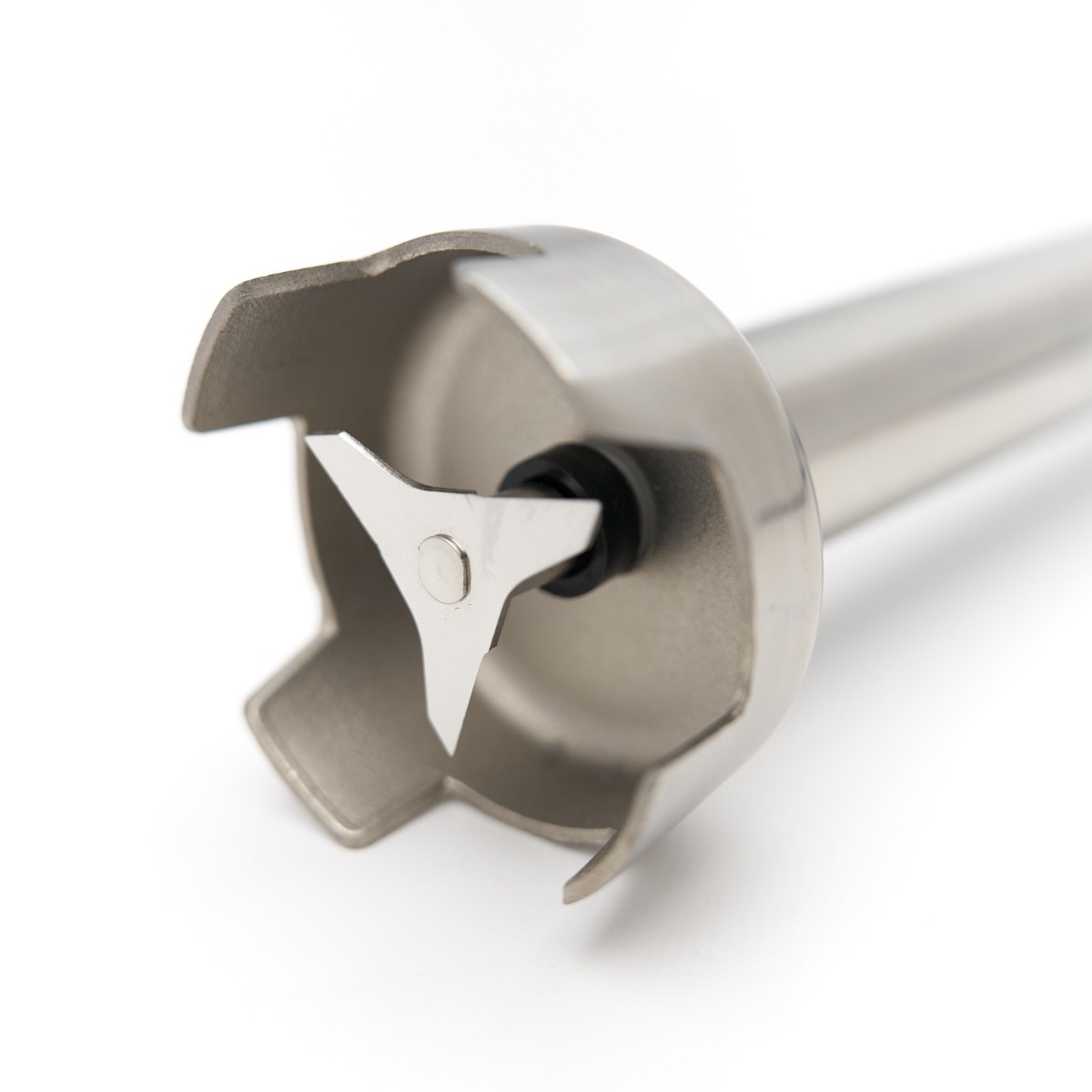 De afneembare staaf van 36 cm is vervaardigd uit hoogwaardig roestvrij staal en gekoppeld aan een versterkte, dubbel gelagerde messenkop. De 27 cm insteekdiepte maakt deze mixer ideaal voor diepe kommen en pannen, waardoor je efficiënter werkt in keukens met hoge productievolumes. Dankzij de smalle diameter en uitgebalanceerde constructie blijft de mixer wendbaar en stabiel, zelfs bij intensief gebruik.