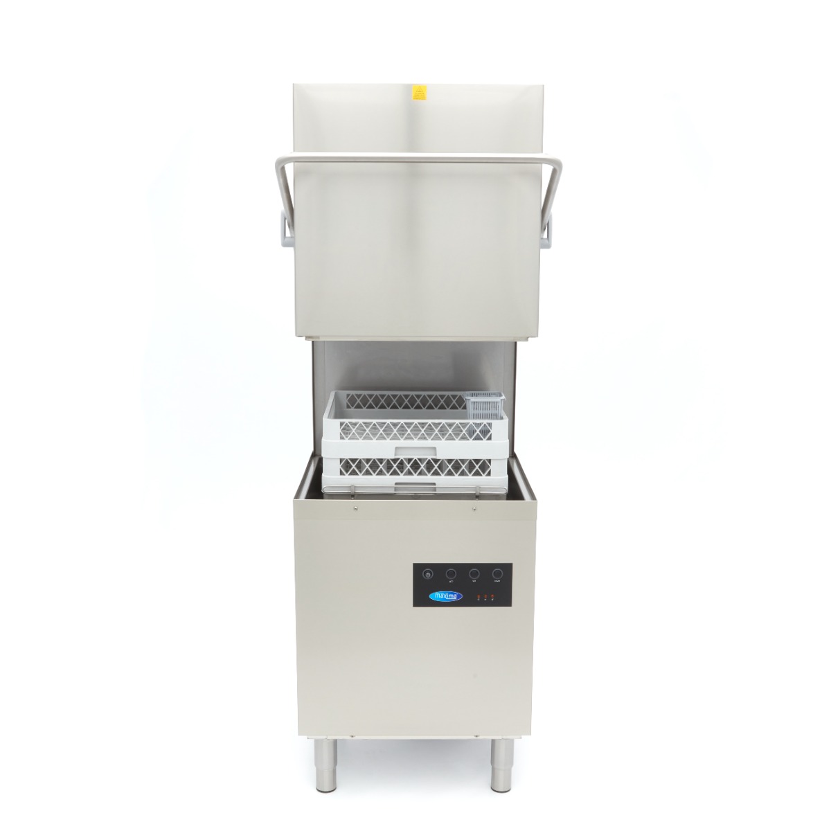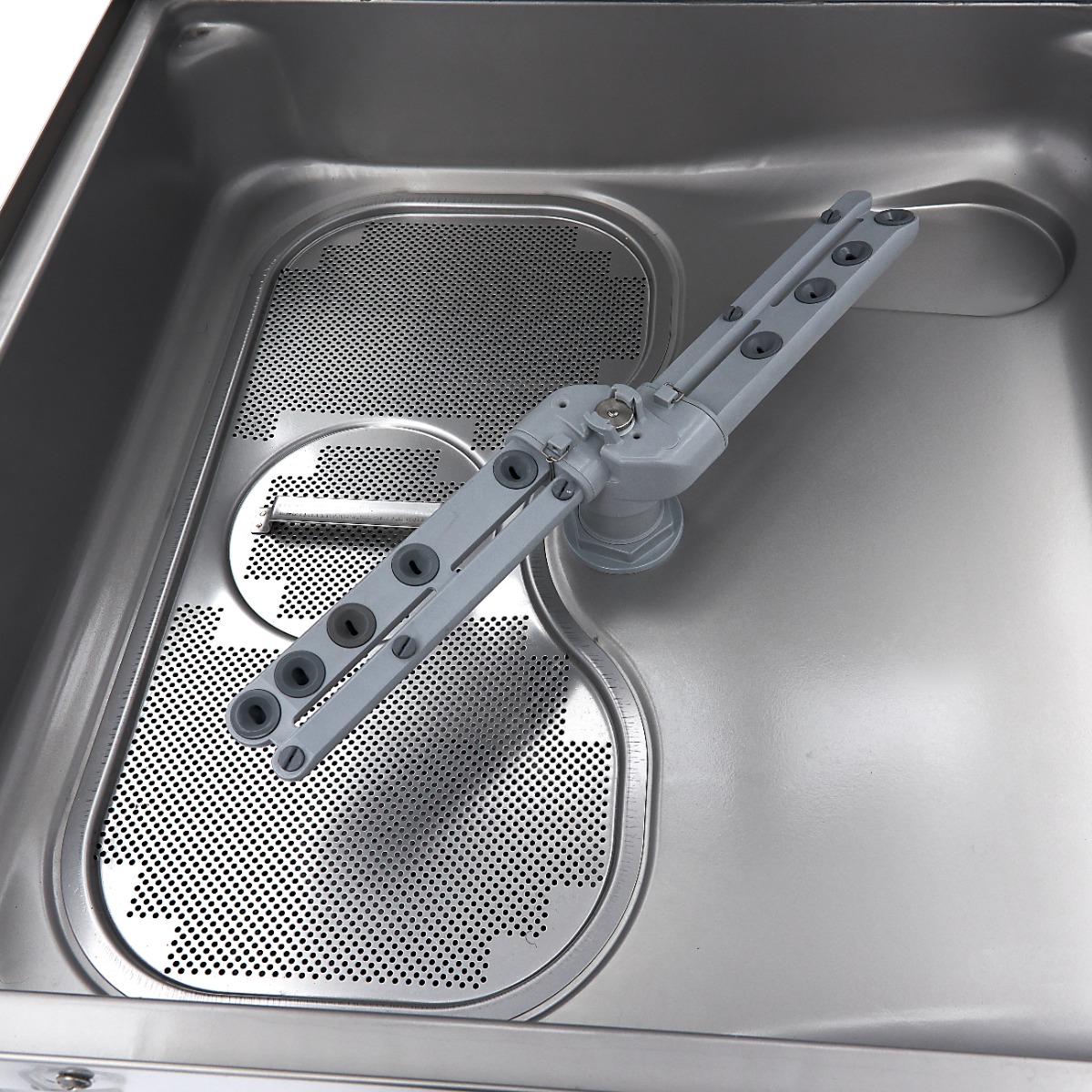 In grote horecagelegenheden die met grote hoeveelheden vuile vaat werken, is deze doorschuif vaatwasser onmisbaar. Je kunt de korven er snel doorheen halen, zodat je zeer efficiënt en snel de vaat schoon wast. Deze professionele machine heeft twee wasprogramma’s: 90 en 180 seconden. Allebei de programma’s zijn inclusief 15 seconden spoelen. De wastemperatuur is 60°C en de spoelcyclus is 85°C, waardoor alles sneller droogt. Daarnaast is het ook een zeer stille machine die minder dan 65 dB produceert. Met slechts 2,8 liter waterverbruik per cyclus is de doorschuif vaatwasser zuinig in gebruik. Het bedieningspaneel is IPX4 beschermd, zodat er geen water achter de gebruiksvriendelijke knoppen kan komen. Er zijn vier knoppen: een aan/uit-knop, een knop om de wascyclus te starten/stoppen, een knop om het wasprogramma in te stellen en een knop om de afvoerpomp te starten. Verder heeft deze vaatwasser ook temperatuur- en spoelglansindicatoren.