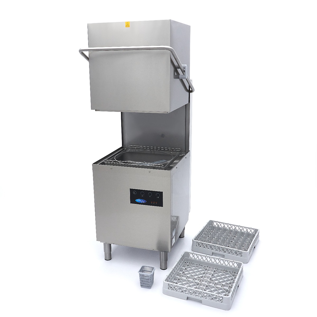 De doorschuif vaatwasser is volledig gemaakt van roestvrij staal, waardoor hij zeer snel en gemakkelijk te reinigen is. De gladde oppervlakken kunnen met een vochtige doek worden afgenomen. De wasarmen aan de binnenkant zijn gemaakt van speciaal ABS en kunnen met een doek en water worden schoongemaakt. De vaatwasser is uitgerust met afvoer-, spoelglansmiddel- en zeeppomp. Let op: de spoelglansmiddel- en zeeppomp kunnen alleen vloeibaar wasmiddel opnemen.