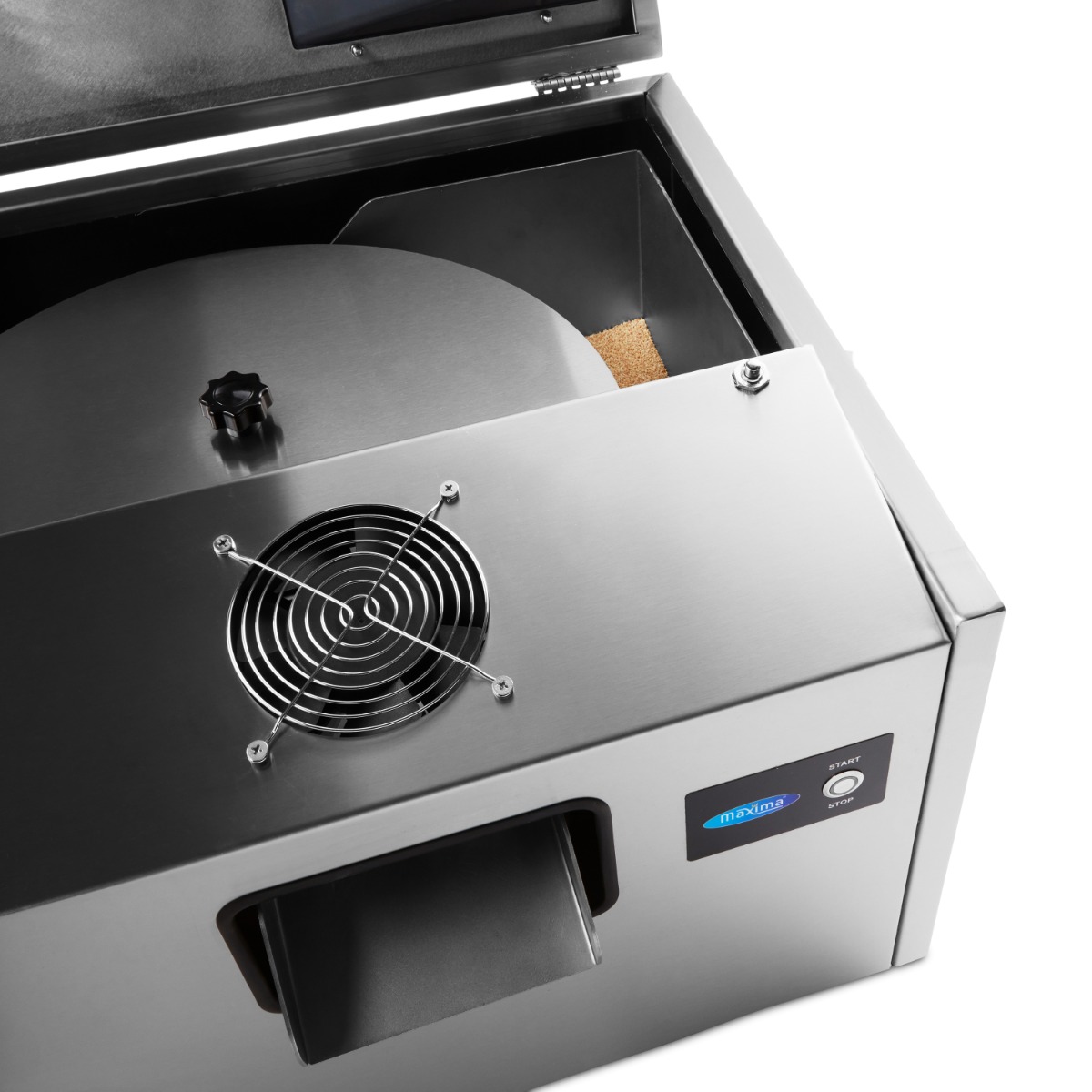 Deze bestekpoleermachine poetst ongeveer 3000 messen, vorken en lepels per uur, afhankelijk van de grootte van het bestek en de snelheid waarmee je het bestek in het apparaat doet.