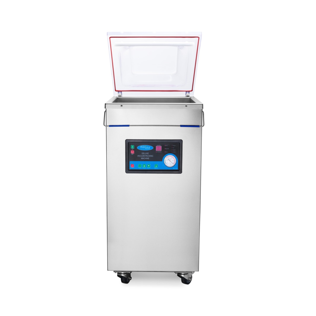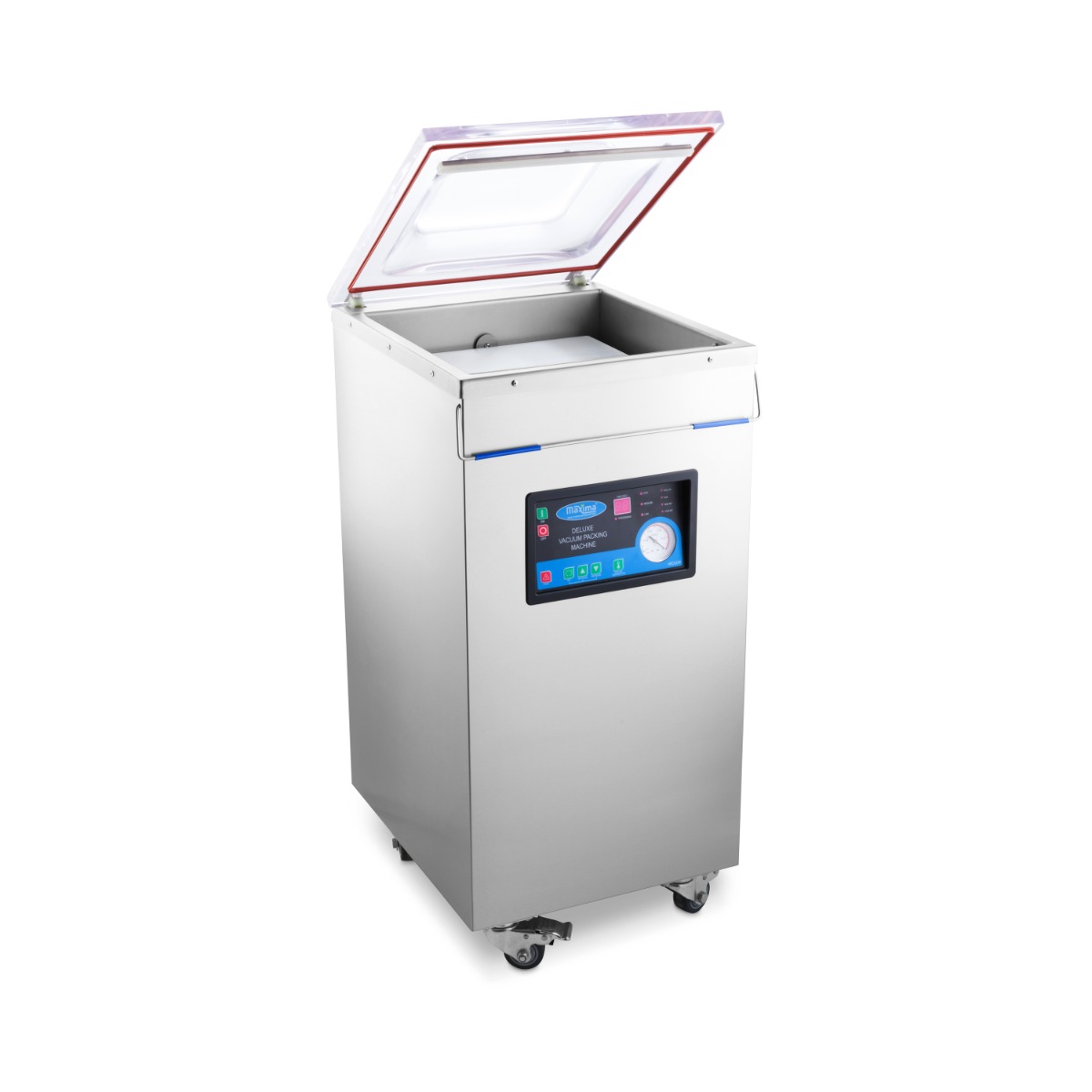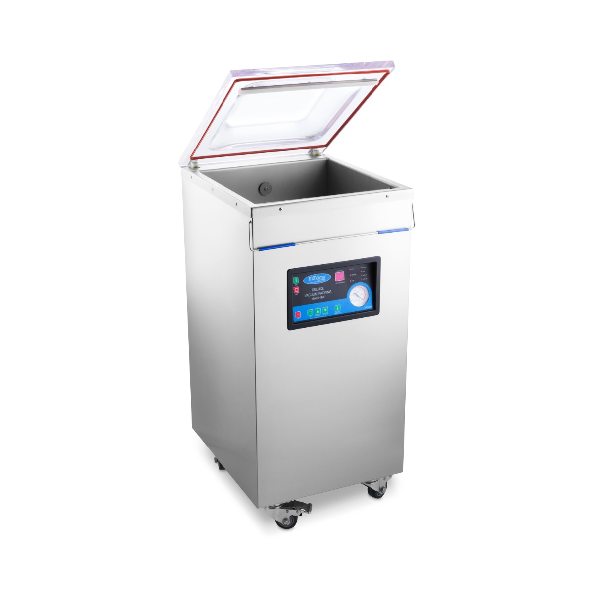 Deze verrijdbare vacumeermachine met ruime kamer voor het vacumeren van grote hoeveelheden voedsel is een aanwinst voor elke horecazaak. Niet alleen voorkom je verspilling, maar je kunt etenswaren langer bewaren. Een ander voordeel van het gebruik van deze professionele verpakkingsmachine is dat je ruimte bespaart in je koelkast of vriezer. De compacte vacumeerzakken nemen minder plek in beslag dan bijvoorbeeld plastic voorraaddozen of GN-bakken. Juist omdat de lucht wordt onttrokken aan het eten, blijft het langer vers en houdbaar. Dit vloermodel beschikt over een volledig automatisch verpakkingsproces.
