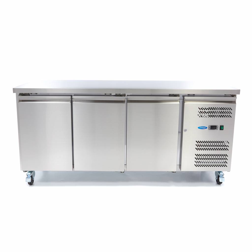 Deze professionele vrieswerkbank is voorzien van drie robuuste RVS-deuren met achter elke deur een in hoogte verstelbaar rooster. Om de temperatuur in te stellen tussen de -10 en -20 graden Celsius maak je gebruik van de handige digitale temperatuurcontroller van DIXELL. Ook beschikt de vrieswerkbank over een automatische ontdooiing. Aan drie zijden bevindt zich een ingeschuimde verdamper en het koelmiddel dat gebruikt wordt voor deze vriezer is R290 en vrij van CFC.