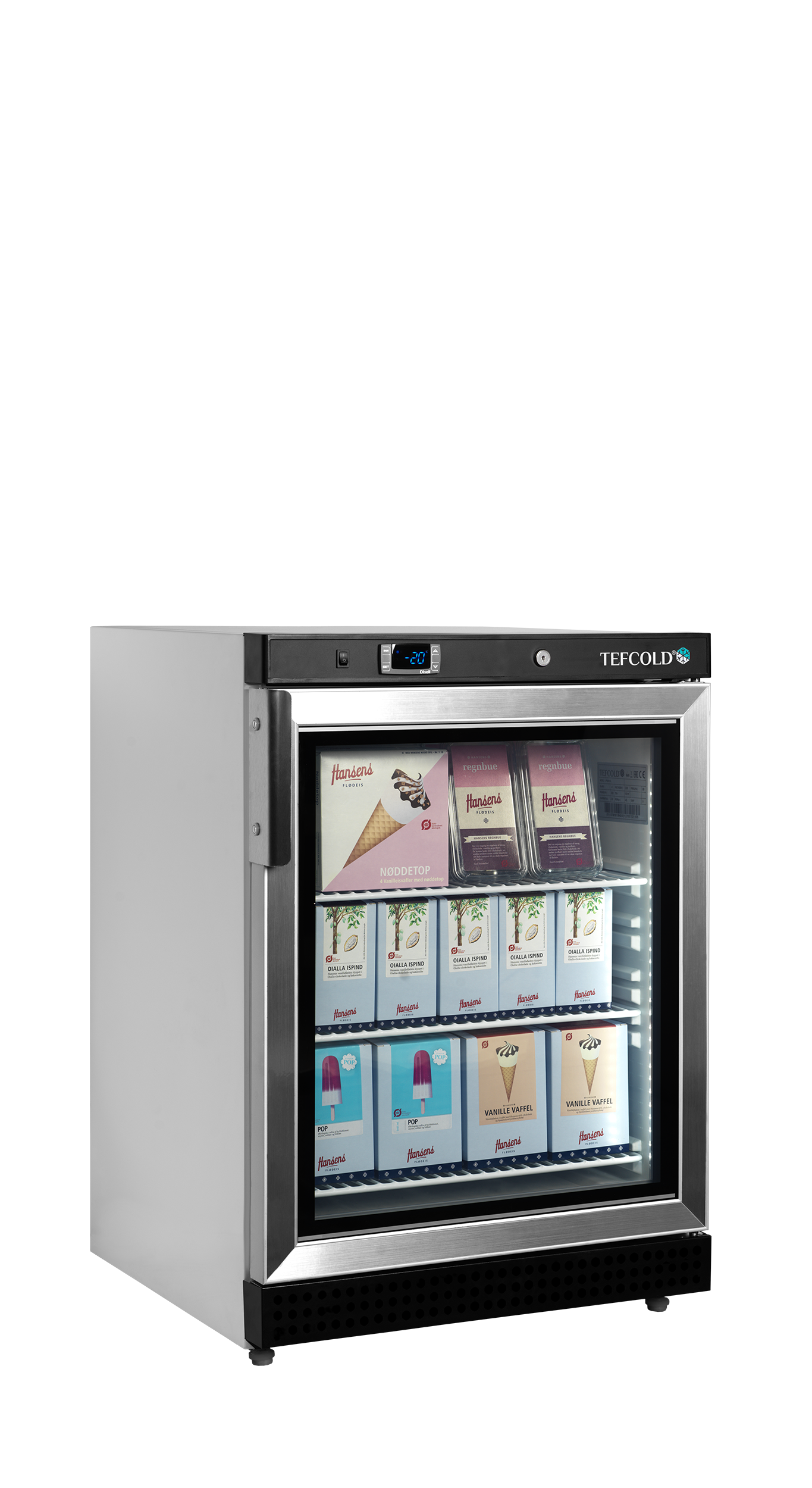 De UF-VG-serie displayvriezers is de geventileerde versie van onze witte vriezers met glazen deur. Hij is verkrijgbaar in verschillende maten. Het geventileerd koelsysteem zorgt voor een gelijkmatige temperatuur in de hele kast. De temperatuur kan worden ingesteld op een gebruiksvriendelijk digitaal thermostaatdisplay.